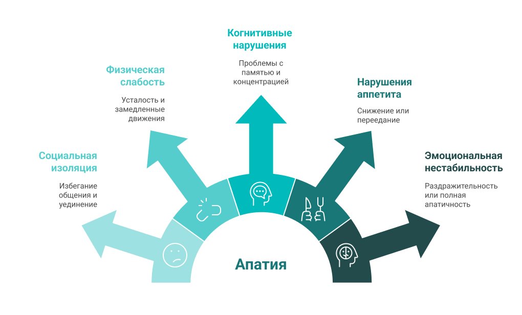 Апатия – это глубокое эмоциональное обессиливание, сопровождающееся равнодушием, утратой способности радоваться жизни. Человек перестаёт испытывать удовольствие от привычных вещей. Постоянная вялость, сонливость, ощущение бессилия, медлительность, нежелание что-либо делать постепенно превращают жизнь в монотонную рутину, лишённую красок. Со временем усиливается чувство отчуждения: человек избегает общения, предпочитает одиночество, так как любое взаимодействие кажется утомительным, бессмысленным.